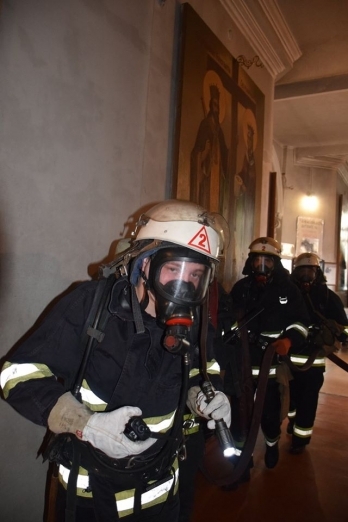- По тактическому замыслу спасатели боролись с пожаром, возникшим в результате нарушения правил пожарной безопасности при проведении огневых работ в подсобном помещении Колокольни собора. По легенде, в бытовых помещениях находятся два служителя, и еще 50 человек находится в Соборе. Служитель церкви сообщает о пожаре, проводит первоочередные меры по эвакуации людей и тушению пожара первичными средствами. На момент прибытия оперативно-спасательных подразделений площадь пожара составила 25 квадратных метров. Двое мужчин оставались в Соборе и не могли самостоятельно выйти в безопасную зону. Огонь продолжал распространяться и существовала угроза его опрокидывания на смежные помещения, - говорится в сообщении.