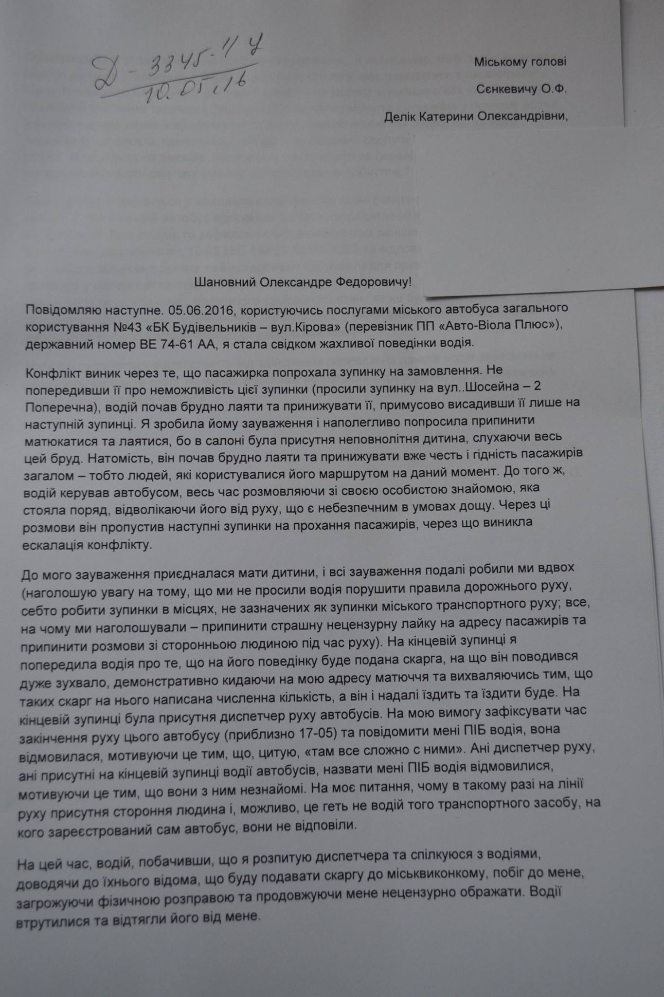 В Николаеве водитель маршрутного такси №43 (ВЕ 74-61 АА) обматерил пассажиров и угрожал физической расправой, если на него напишут жалобу в горисполком. Конфликт произошел еще 5 мая, но из-за майских праздников жалоба в горисполком была подана 10 мая.