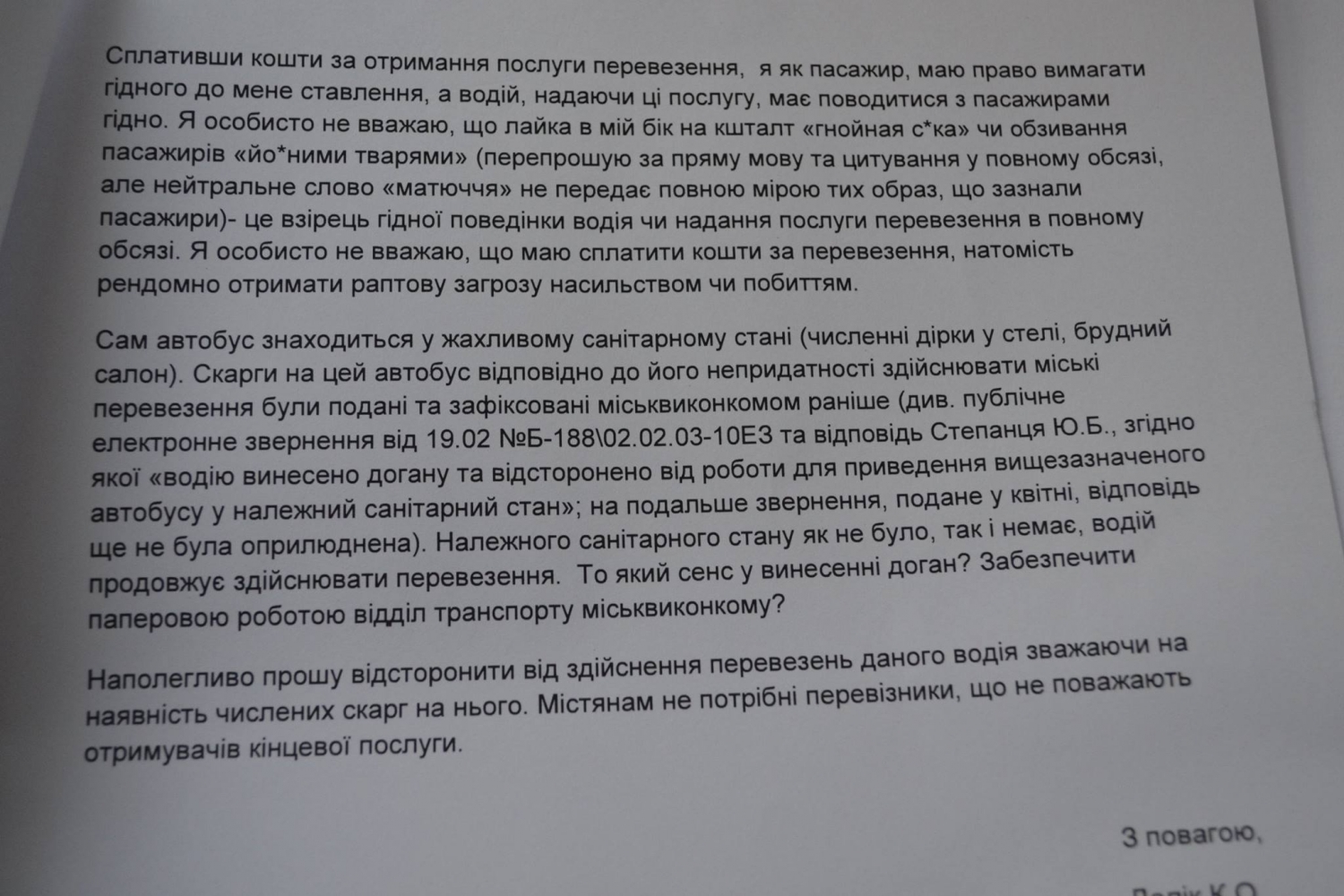 – Заплатив деньги за услуги по перевозке, я как пассажир имею право требовать достойного ко мне отношения, и водитель, который предоставляет эту услугу, тоже должен вести себя с пассажирами достойно. Я не считаю, что ругань в мою сторону наподобие «гнойная с*ука» или обзывание пассажиров «йо*ными тварями» – это образец достойного поведения водителя или предоставления услуг, – отметила в жалобе девушка.