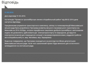Электронная петиция с предложением провести троллейбусную линию в Корабельный район, зарегистрированная на сайте Николаевского городского совета, набрала больше 1000 голосов.