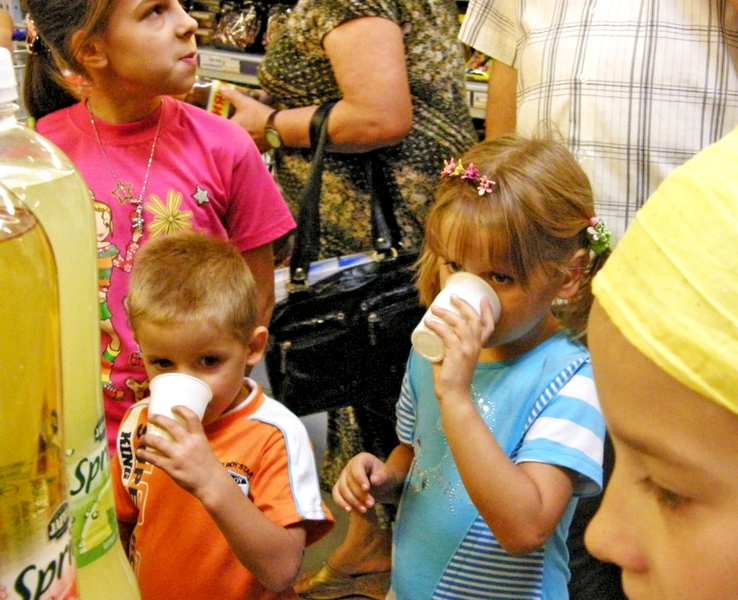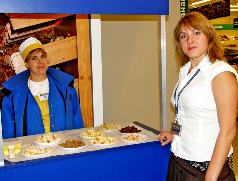 Сегодня, в виде исключения, в «МЕТРО» пускали маленьких детей – электрогрузчики сегодня не работали. Малышей конкурсами и играми развлекали клоуны. Возле многих отделов были представители разных торговых марок, представляющие на дегустацию свой товар: вина, коньяки, соки, колбаса, котлеты, выпечка, и даже пиво и квас от торговой марки «ARO» - одного из производителей от «МЕТРО».
