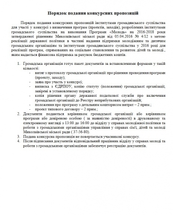 Управление по делам семьи, детей и молодежи Николаевского городского совета объявляет конкурс проектов относительно детей, молодежи, женщин и семьи, разработанных институтами гражданского общества, для реализации которых предоставляется финансовая поддержка.
