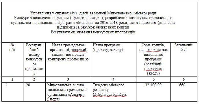 Конкурсная комиссия при Николаевском горсовете определила перечень программ (проектов, мероприятий), разработанных институтами гражданского общества на выполнение программы «Молодежь» на 2016-2018 годы, которые получат финансирование из городского бюджета.