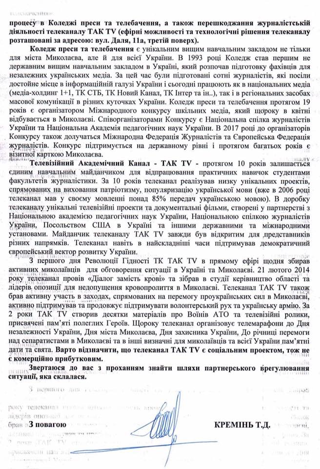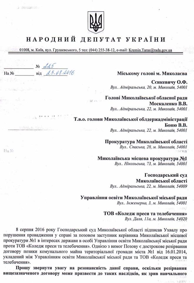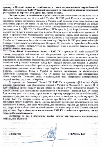 Народный депутат Украины Тарас Креминь поддержал сторону «Колледжа прессы и телевидения», призвав управление образования и городскую власть Николаева к взвешенным административным решениям.