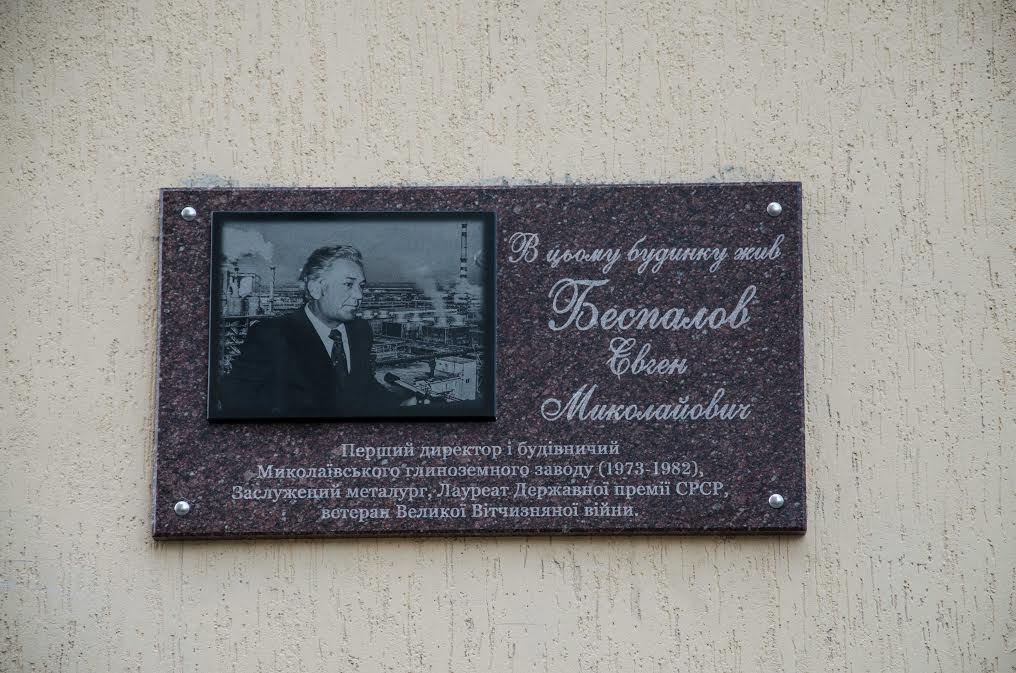 Ко Дню города Николаева, в пятницу, 9 сентября, в Корабельном районе была торжественно открыта мемориальная доска Евгению Беспалову – строителю и первому директору Николаевского глиноземного завода. 10 лет он руководил предприятием, сделав завод лучшим во всем Советском Союзе, и который с тех пор ни на день не прекращает работу.