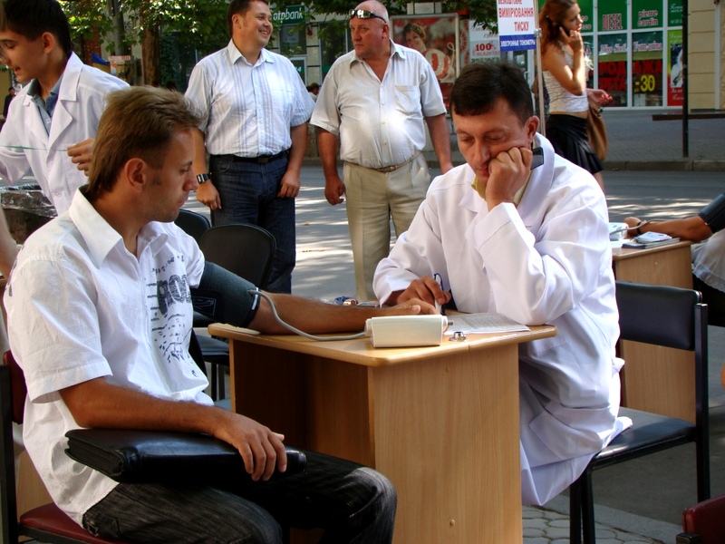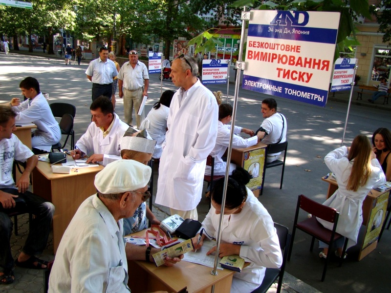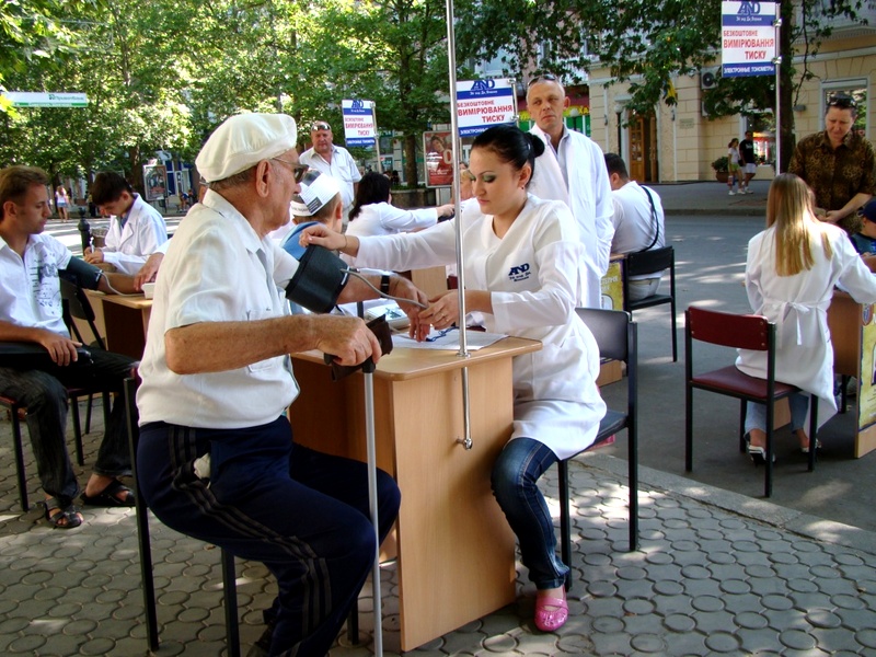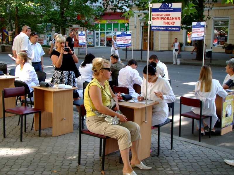 20 августа на Советской (пересечении с ул. Шевченко) представители фирмы «AND», которая специализируется на выпуске измерителей артериального давления и пульса, а также медики измеряли давление всем желающим. Инициатор акции – Всеукраинское врачебное общество.
