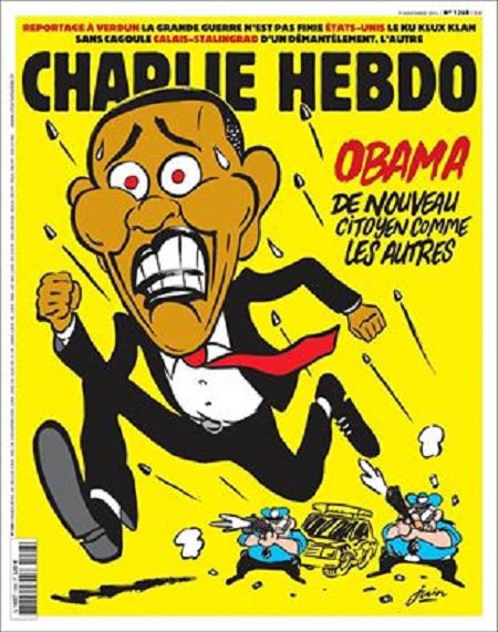 Французский сатирический еженедельник Charlie Hebdo поместил на обложку свежего номера от 9 ноября убегающего президента США Барака Обаму.