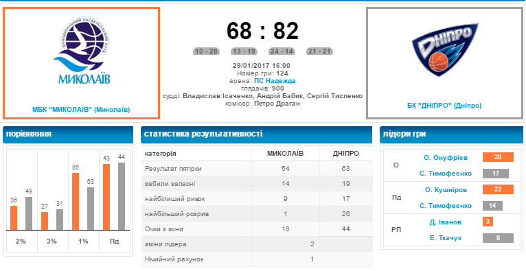 Днепровцы легко стартовали. Их первый успех смогли парировать Онуфриев с Ивановым – 7:6. Однако затем гости наладили прицел. В то время как у николаевцев мяч не шел в корзину. А редкие удачи Горбатюка и Кушнирова позволили только добыть двузначную сумму очков – 10:28.