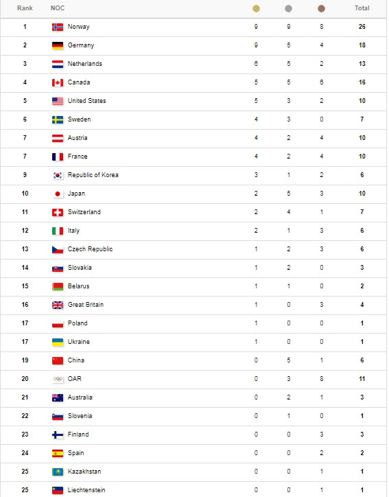Норвегия возглавила «медальный зачет» Олимпийских игр-2018, Украина обошла Россию и ОАР