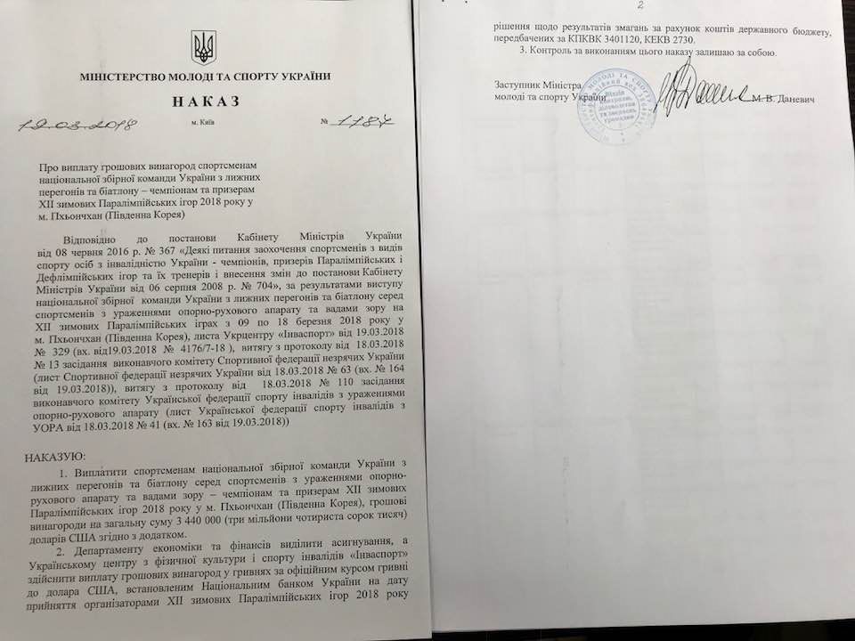 – Информируем общественность, что государство выплатит нашим Чемпионам и призерам XII зимних Паралимпийских игр денежные вознаграждения на общую сумму свыше 90 миллионов гривен. Напоминаю, что наши паралимпийцы получат: за І место - $125 тысяч; за II место - $80 тысяч; за III место - $55 тысяч, – сообщил Николай Даневич.