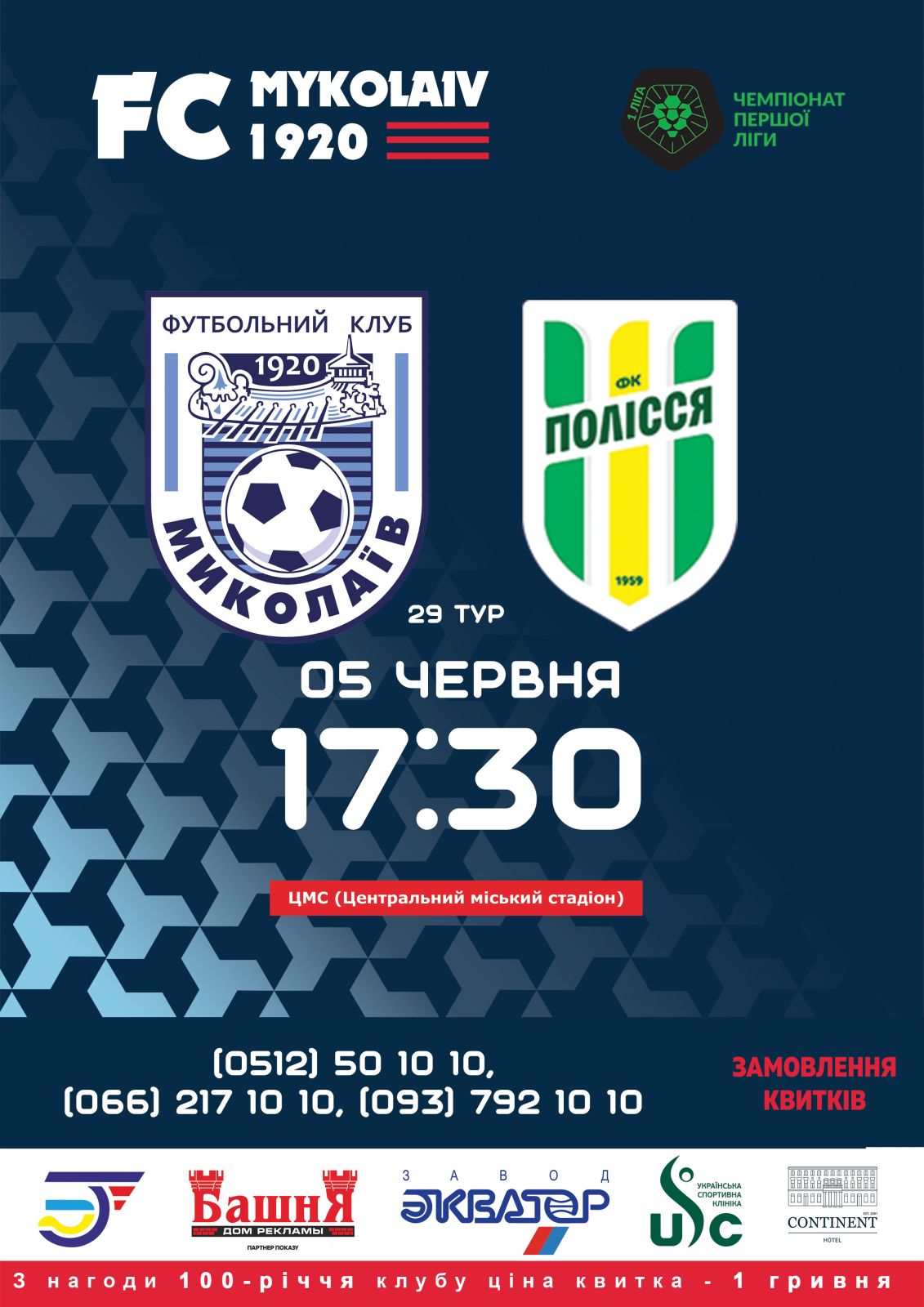 В cубботу, 5 июня, МФК «Николаев» в матче 29-го тура чемпионата Украины по футболу в первой лиге сыграет с житомирским «Полесьем». Поединок состоится на Центральном городском стадионе. Начало в 17.30.