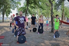 Начали с тренировки. Комплексы упражнений тренеры подготовили отдельно для детей и взрослых. Чтобы все присутствующие почувствовали настоящую спортивную атмосферу, для них в парк привезли тот инвентарь, с которым работают посетители клуба. Также в этот день спортсмены могли испытать себя на гибкость на тренировке по стретчингу.