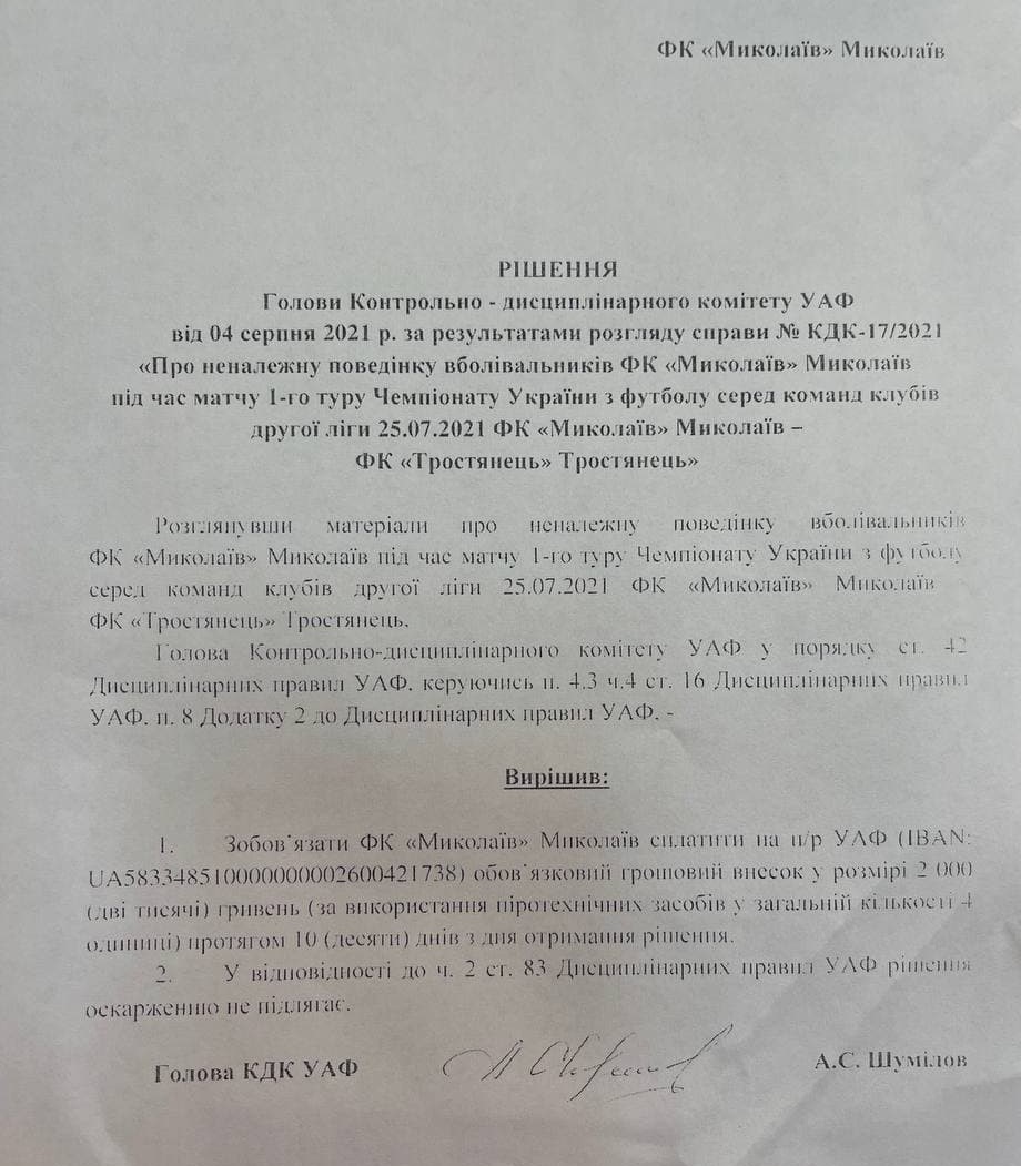 В документе говорится о «ненадлежащем поведении» болельщиков МФК «Николаев» 25 июля во время игры с ФК «Тростянец». В частности, указывается использование пиротехнических средств. Вероятно, речь идет о файерах или петардах, которые ультрас нередко зажигают и бросают с трибун.