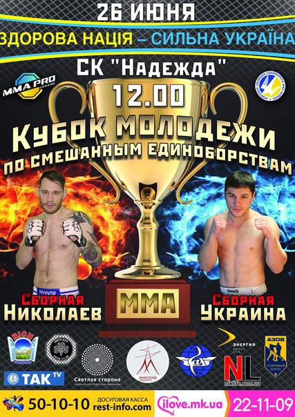 26 июня в 12:00 в спортивном комплексе «Надежда» пройдет ежегодный всеукраинский турнир по смешанным единоборствам «Кубок молодежи по ММА — 2016», в рамках которого состоится профессиональная встреча сборных команд Николаева и Украины.