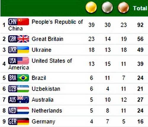 В четвертый день Паралимпийских игр украинским спортсменам удалось завоевать 12 медалей, среди которых 6 стали золотыми, 3 - серебряными и 3 - бронзовыми. Это позволило занять по итогам четырех игровых дней 3-е место, уступая лишь Китаю и Великобритании.