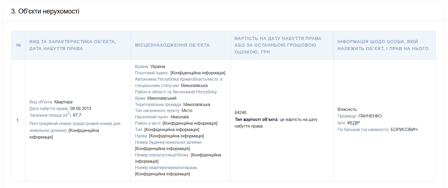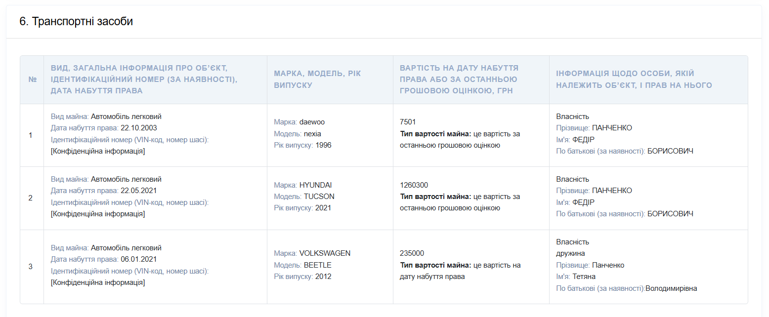 В собственности Федора Панченко с 2013 года находится квартира площадью 67,7 кв. м, а также два автомобиля: Daewoo Nexia 1996 года выпуска и Hyundai Tucson 2021 года выпуска. По последней денежной оценке стоимость второго автомобиля составляет 1 260 300 гривен.