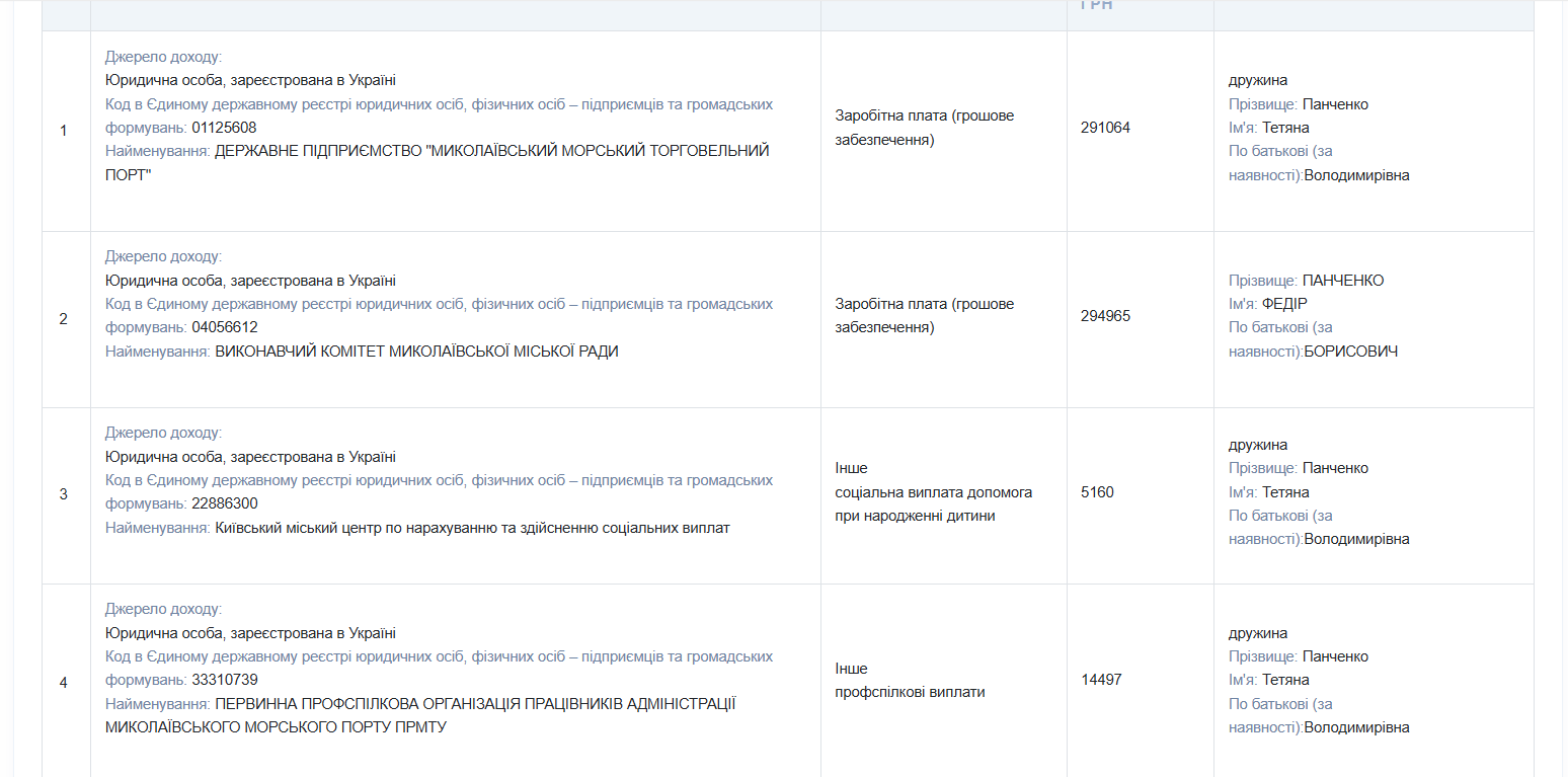 Жена депутата получила 291 064 гривны зарплаты и 14 497 гривен профсоюзных выплат в Николаевском торговом порту, 5 160 гривен выплаты при рождении ребенка и еще 24 500 грн как предприниматель.