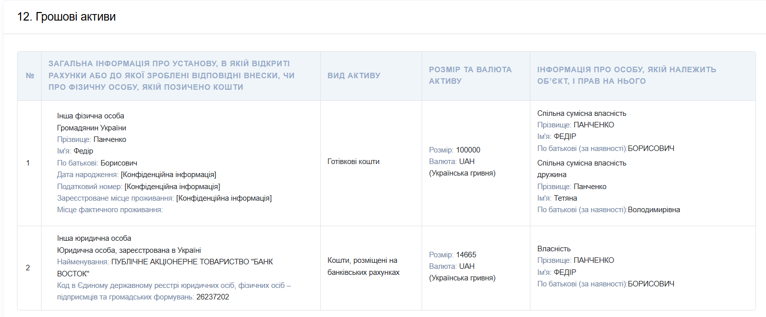 Депутат с женой хранят 100 000 гривен наличными. Кроме того, Федор Панченко задекларировал 14 665 гривен на счете в банке.
