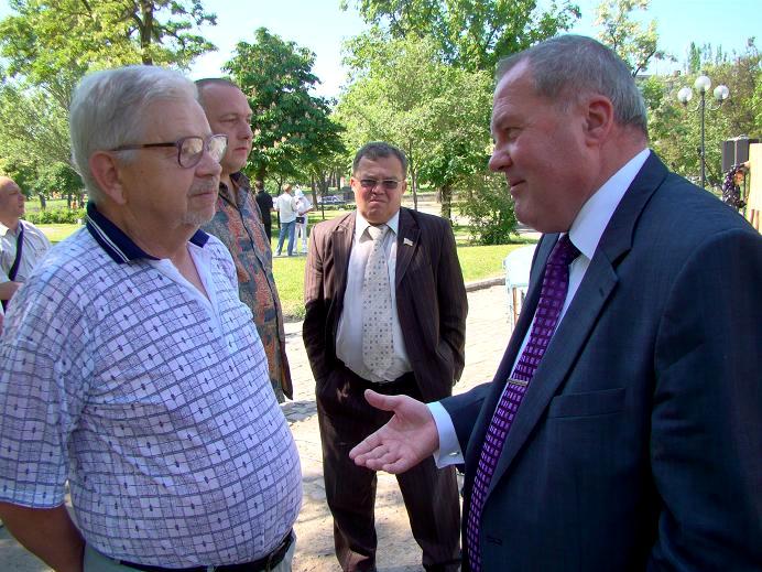 Слева - неизвестный мужчина, справа - мэр Владимир Чайка, на заднем плане в очках - секретарь горсовета Владимир Коренюгин