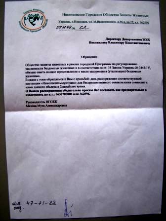 Накануне Нового года представители Николаевского городского общества защиты животных  (НГОЗЖ) обратились в департамент ЖКХ с просьбой дать ответ на вопрос, как выполняются указания мэра  в области координации и урегулирования  мероприятий согласно нормативному документу «Правила содержания домашних животных», принятому в соответствии с Законом Украины № 3447-IV «О защите животных от жестокого обращения».