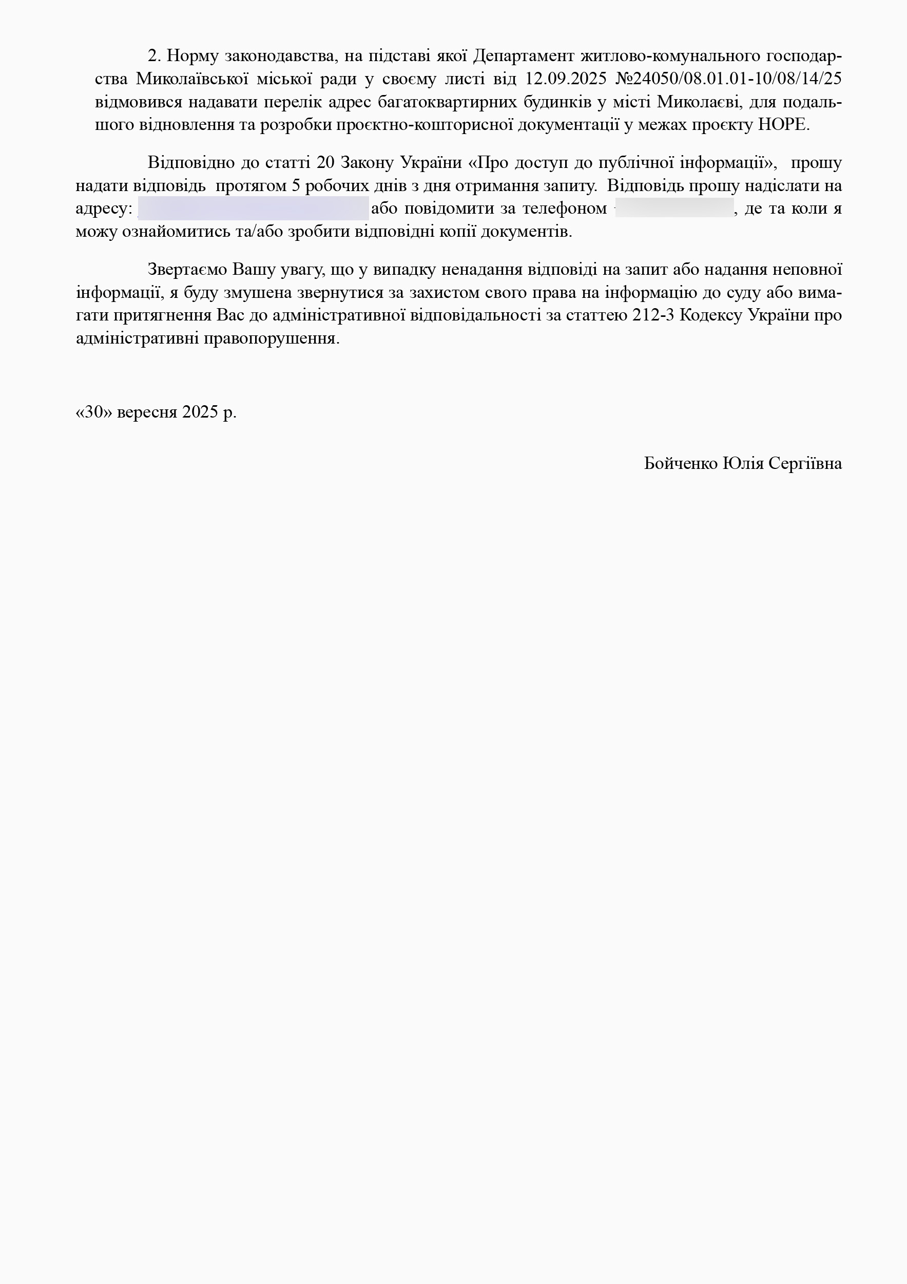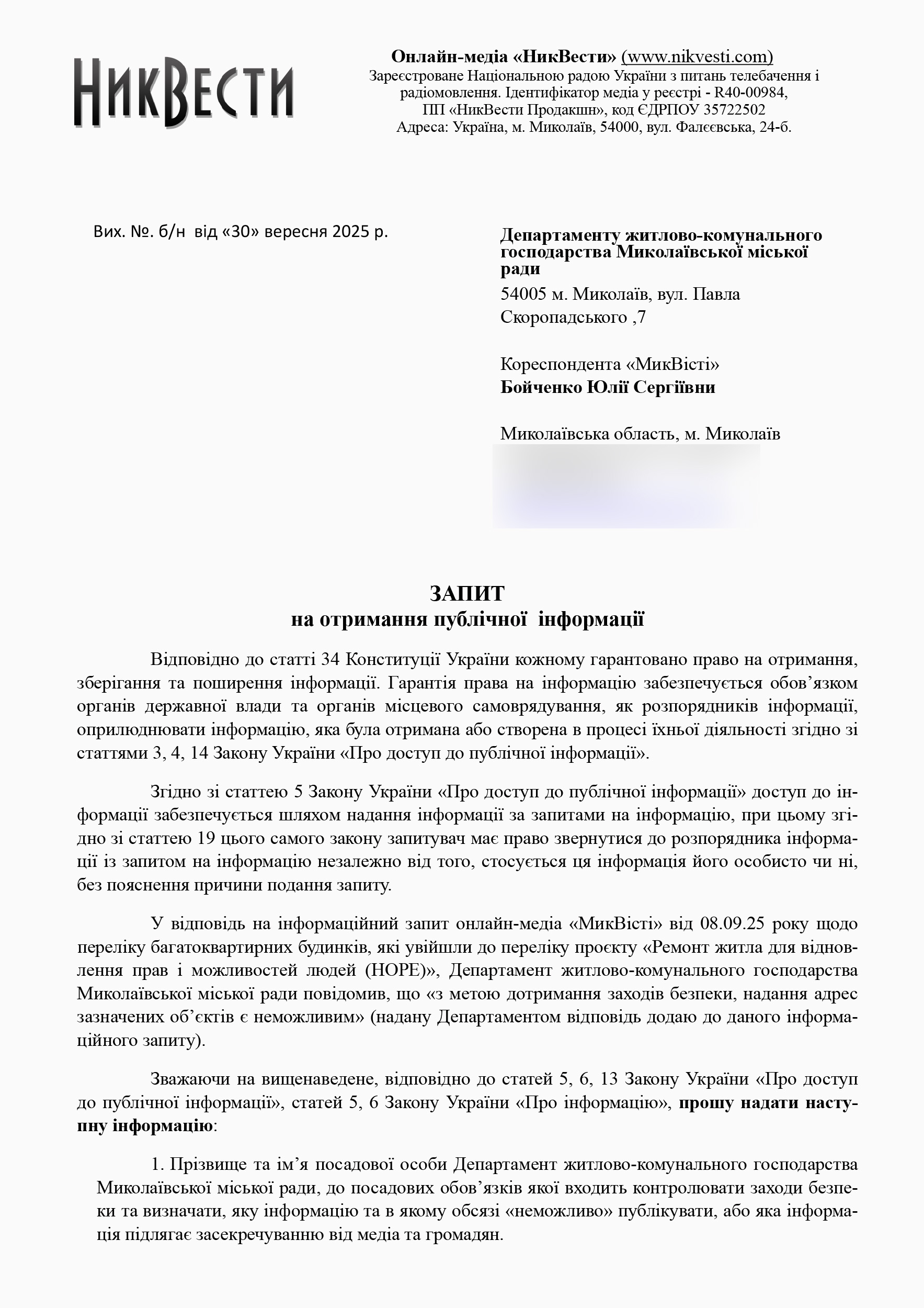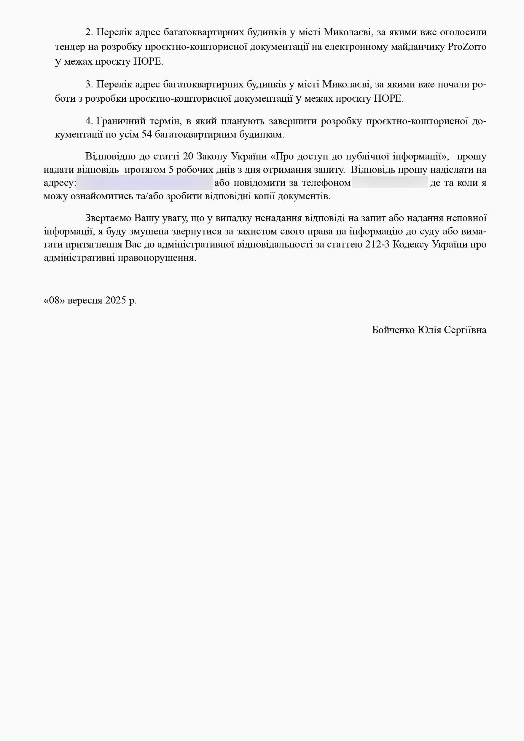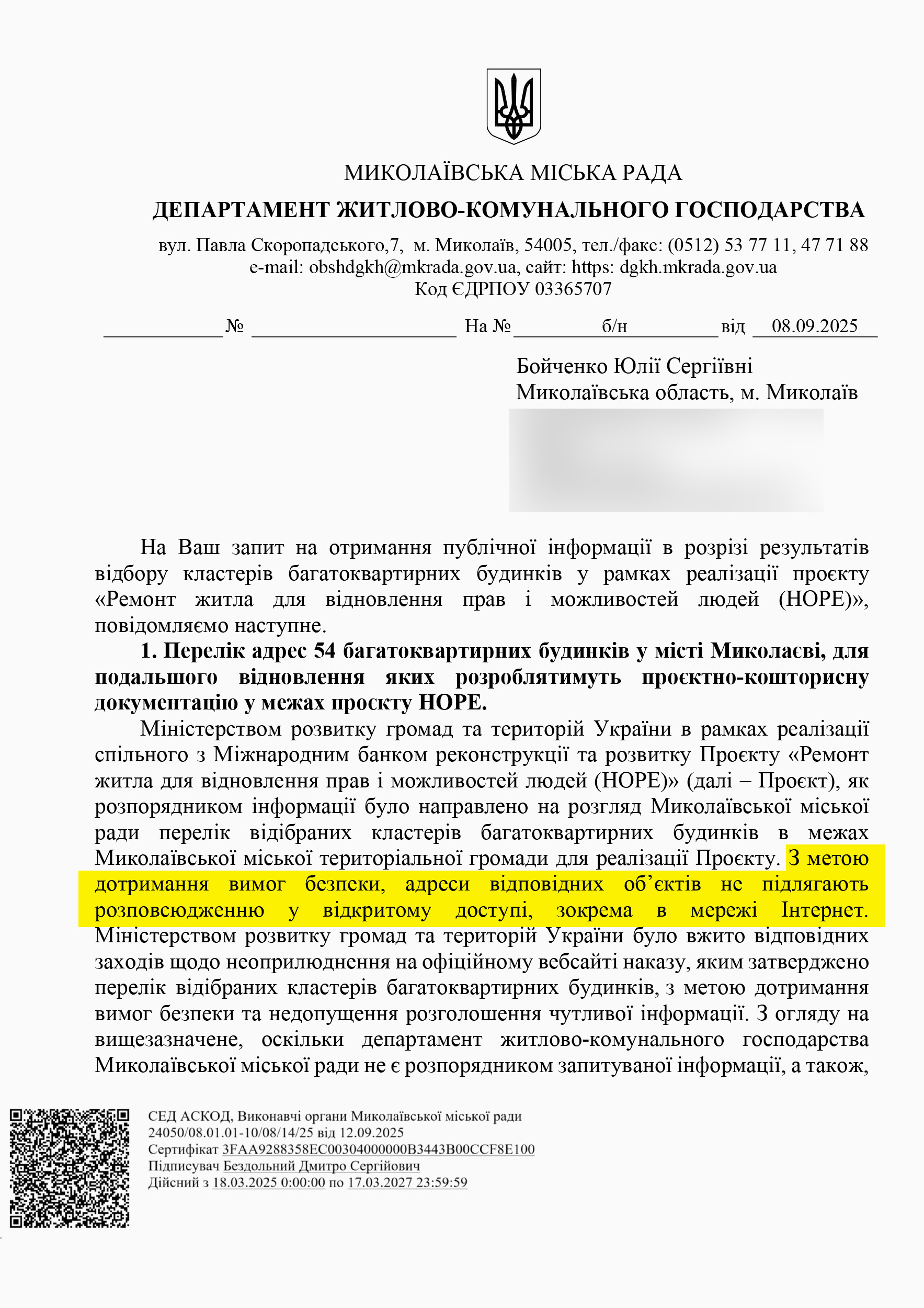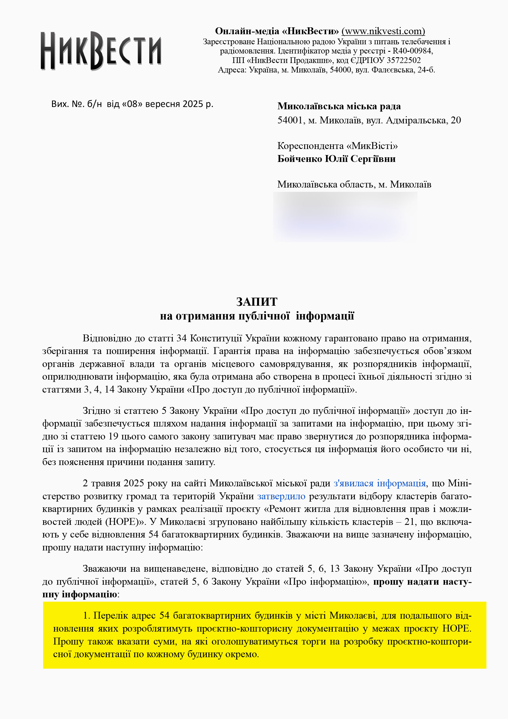 После отказа ГЖКХ мы обратились в центральный орган исполнительной власти, который координирует реализацию «HOPE». В запросе повторили ту же формулировку: предоставить перечень 54 адресов в Николаеве, включенных в программу восстановления, с указанием кластеров и статуса подготовки.