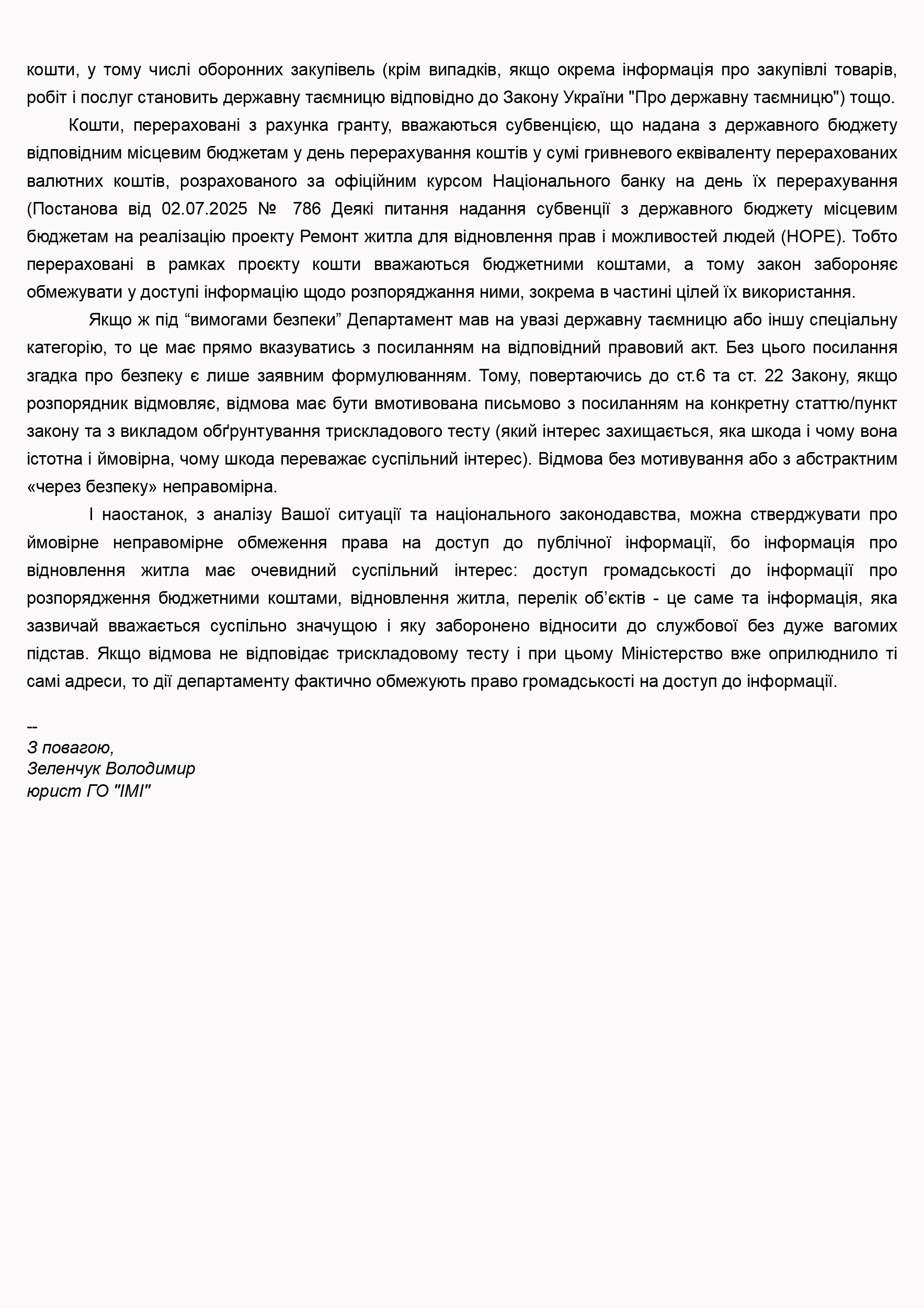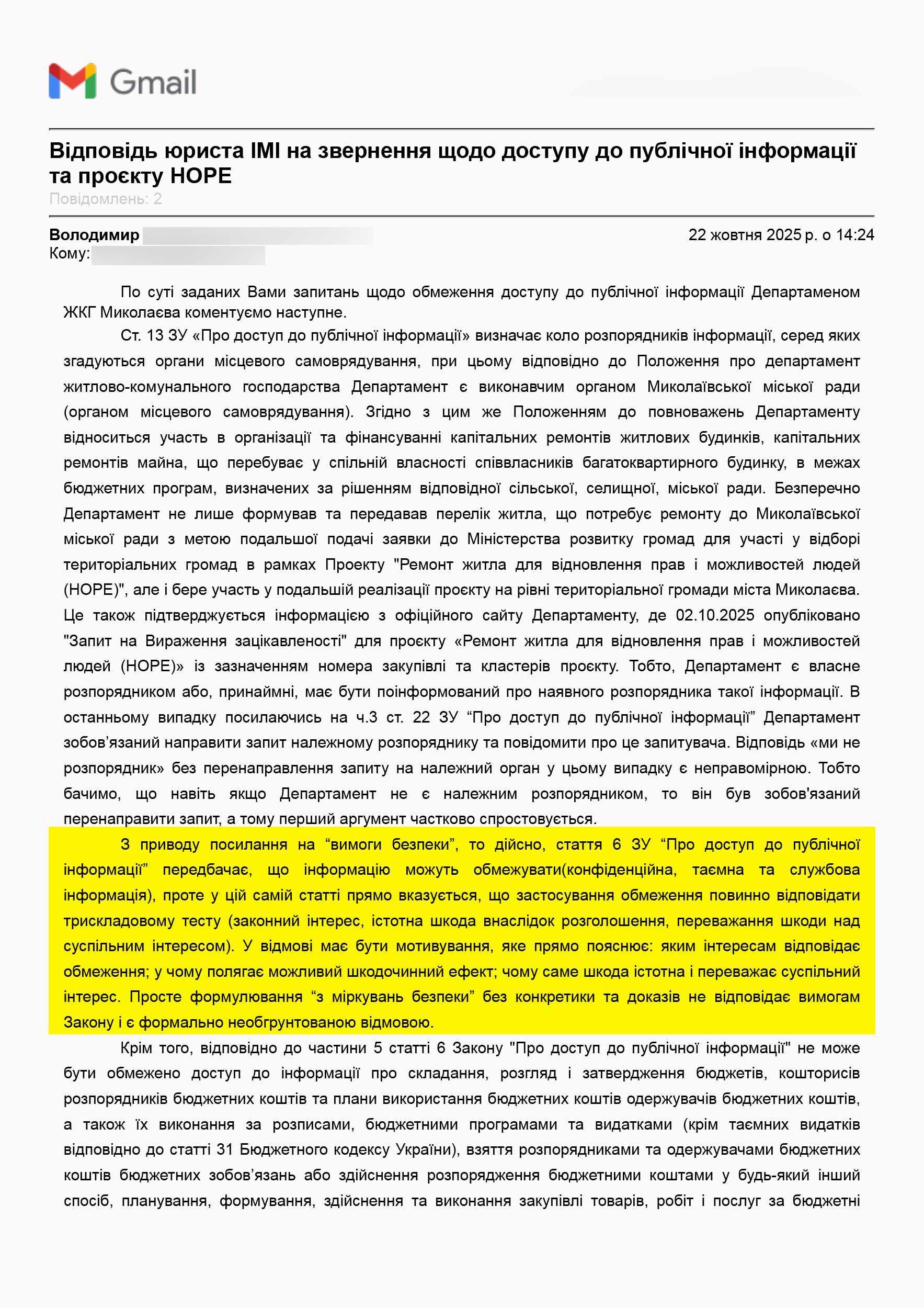 Юрист Института массовой информации Владимир Зеленчук в комментарии «НикВести» объясняет, что такой отказ не соответствует требованиям законодательства: департамент, который формировал и подавал перечень жилья и участвует в реализации «HOPE» на местном уровне, или является распорядителем этой информации, или по крайней мере знает, кто им является, поэтому вместо простого отказа должен был перенаправить запрос в надлежащий орган согласно статье 22 Закона «О доступе к публичной информации».