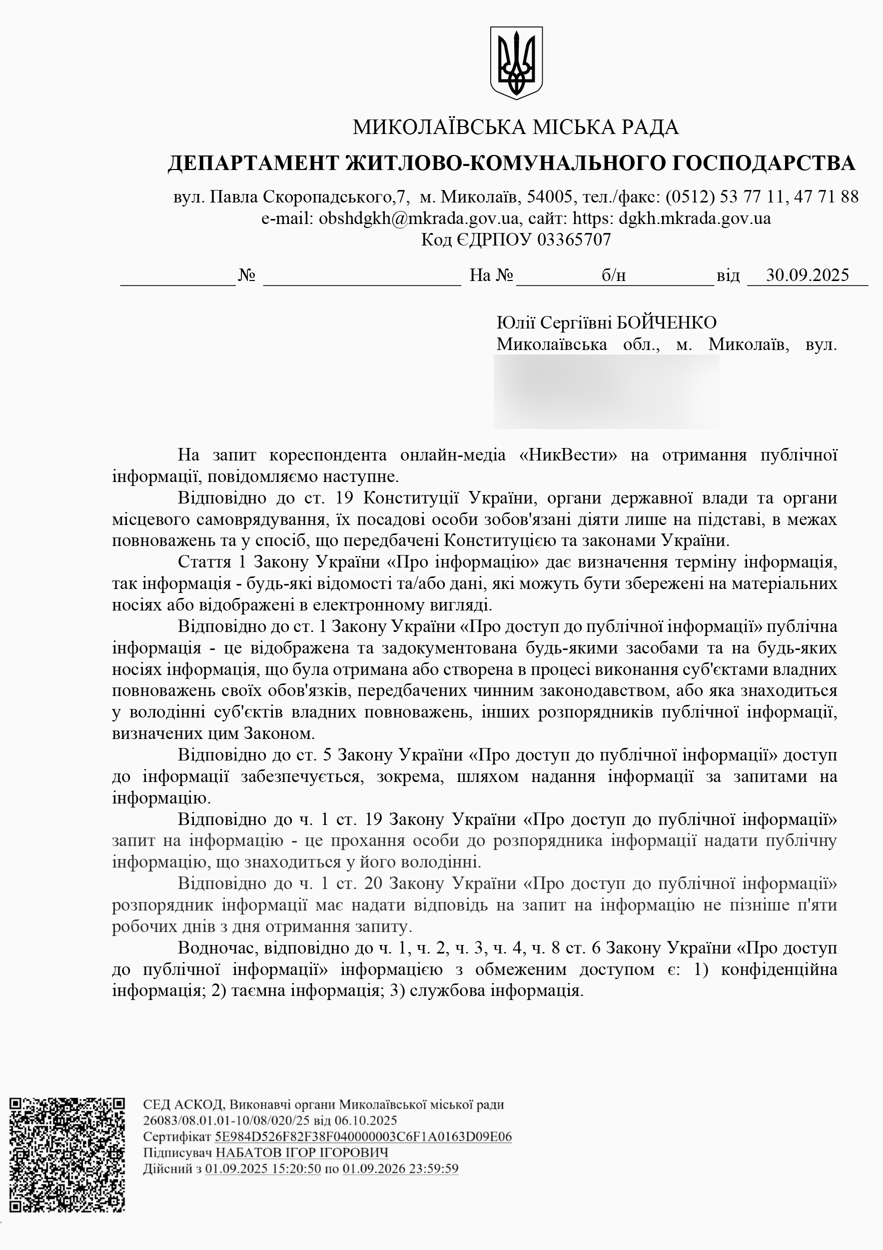 Вместе с тем открытость и прозрачность — это не только формула из речей. Городской голова Александр Сенкевич публично декларирует максимальную публичность работы мэрии и готовность открывать для журналистов ключевые процессы. Для Николаева это принципиально: от того, насколько прозрачно принимаются решения и объясняются шаги, зависит доверие граждан к восстановлению и эффективность контроля за ним. Этот материал — проверка, насколько подчиненные городского головы готовы действовать в соответствии с задекларированными принципами — предоставлять общественно важные данные без отписок и проволочек.