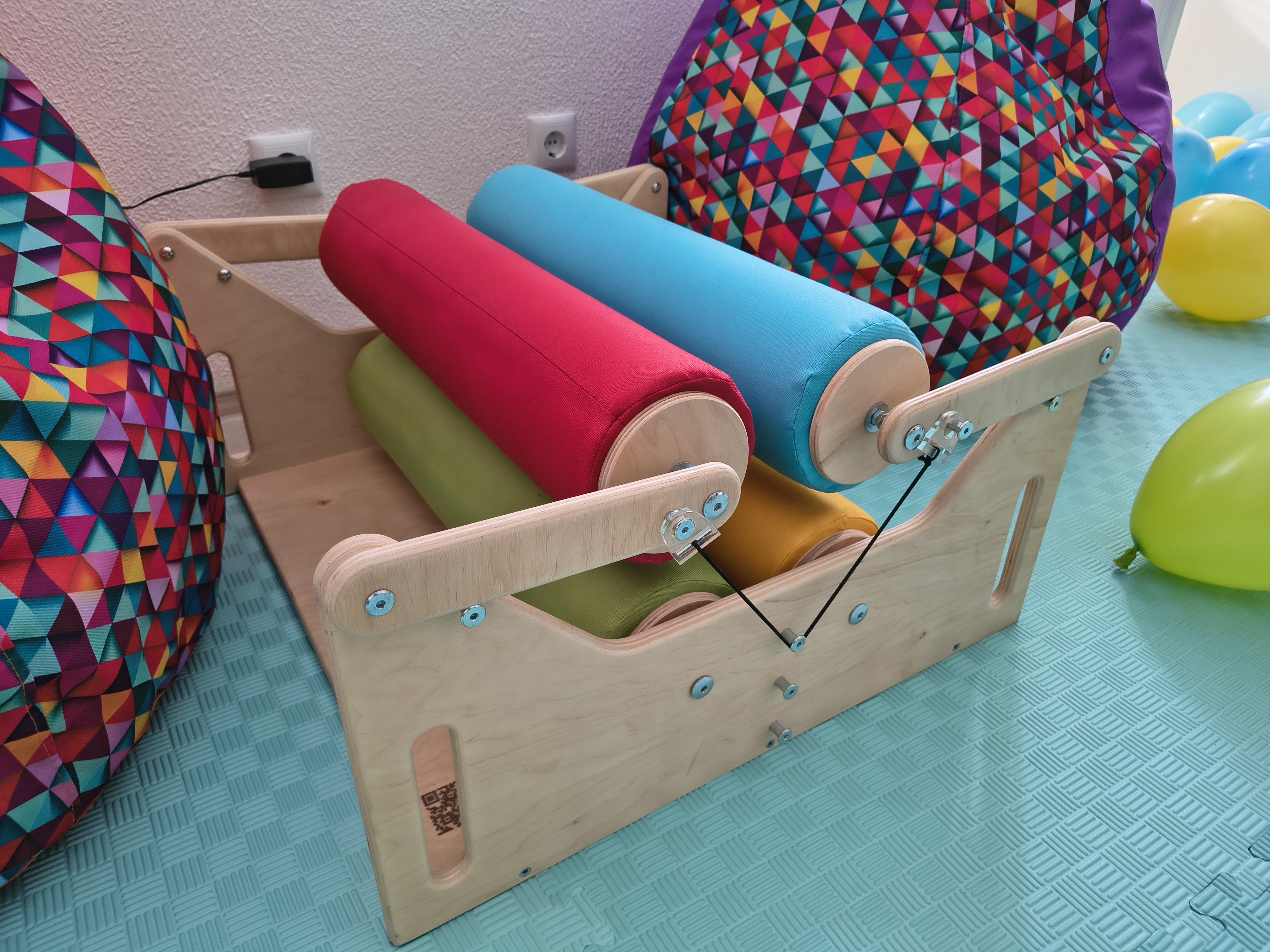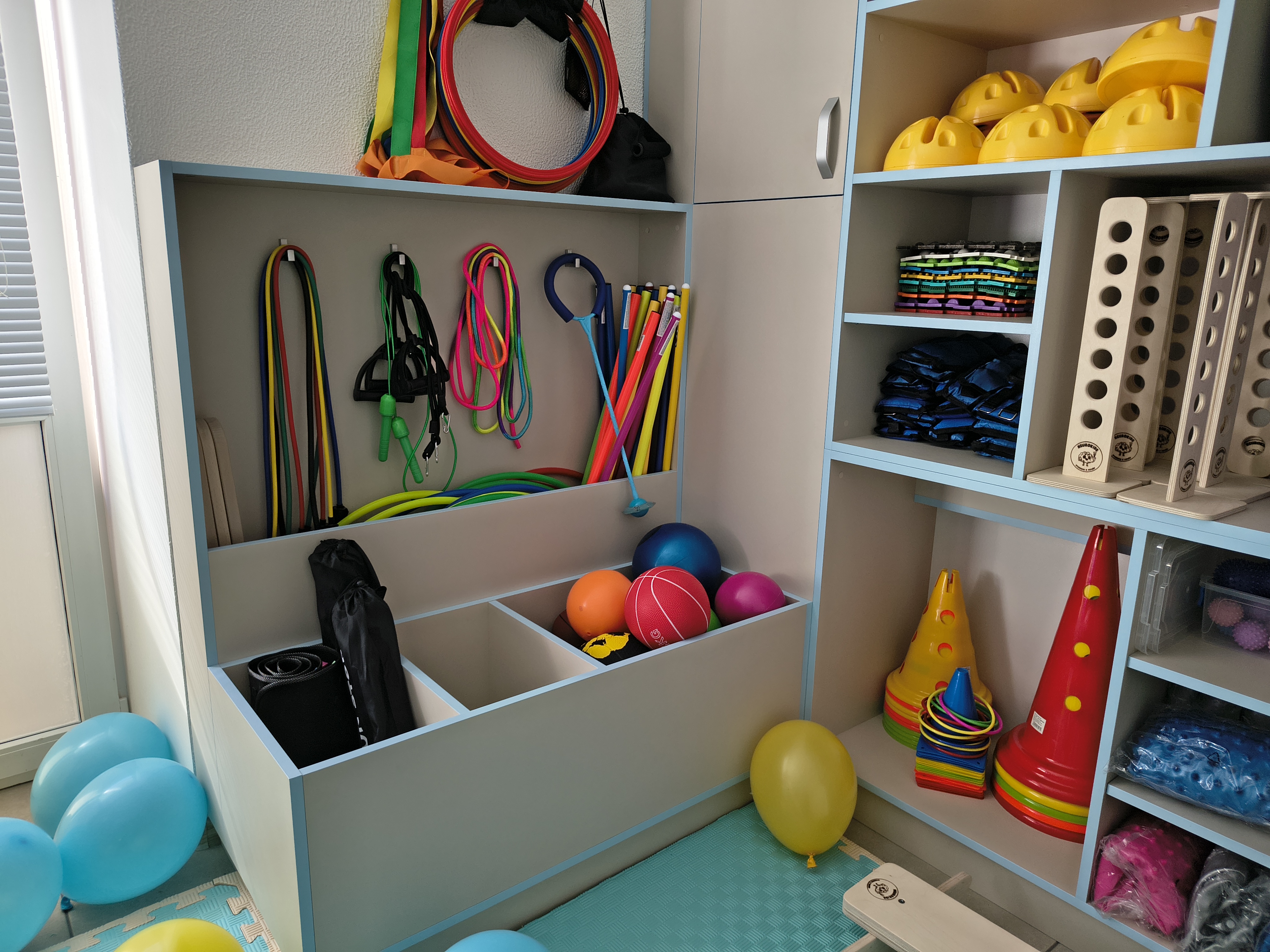 Следующая локация — уже для активной сенсорной интеграции. Жилеты с утяжелением, различные тактильные коврики, фитболы, балансиры, сенсорные дощечки, бизиборды, подвесные системы, сквизер — для детей подготовили множество полезного оборудования.