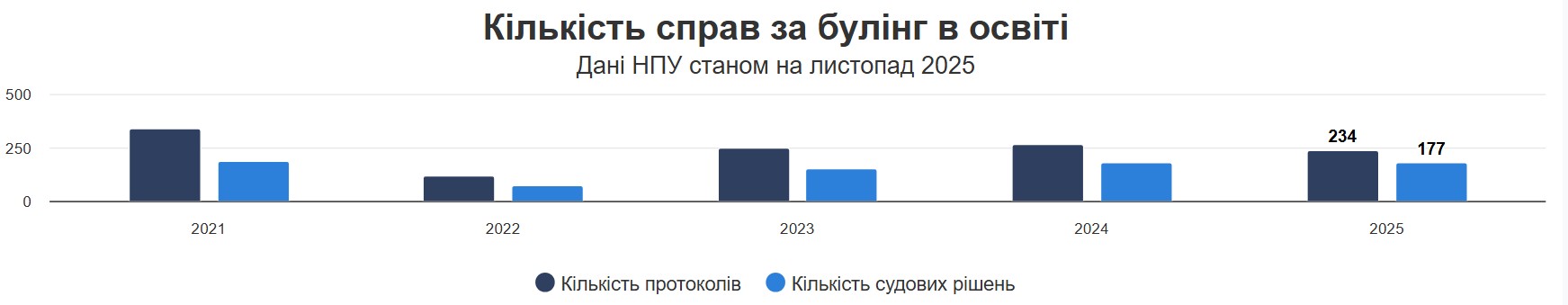 По данным Национальной полиции Украины, в 2025 году в школах зафиксировали более 230 случаев буллинга — это примерно на 7% больше, чем годом ранее. В среднем ежемесячно составляли около 33 административных протоколов, и более половины из них касались несовершеннолетних. Часто такие ситуации происходят на глазах у других детей, но до суда доходит лишь часть дел.