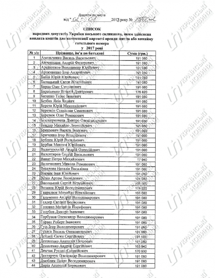 Председатель Верховной Рады Андрей Парубий и 175 депутатов получили 32,6 миллиона гривен из государственного бюджета для компенсации стоимости аренды жилья или найма гостиничного номера в 2017 году.