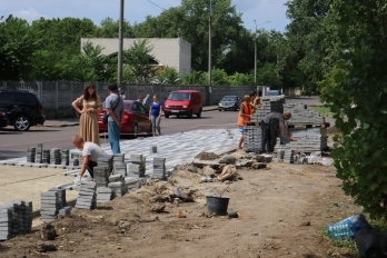 На данный момент рабочие укладывают плитку на этом объекте. В этом сквере кроме уличной мебели на зеленой зоне будет установлен арт-объект к 230-летию города, проект которого победил в открытом конкурсе.