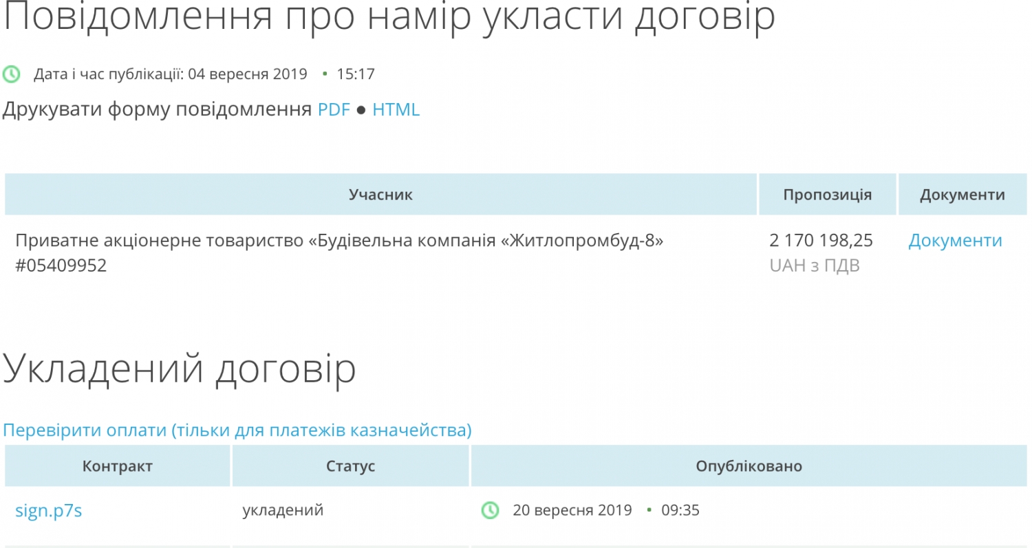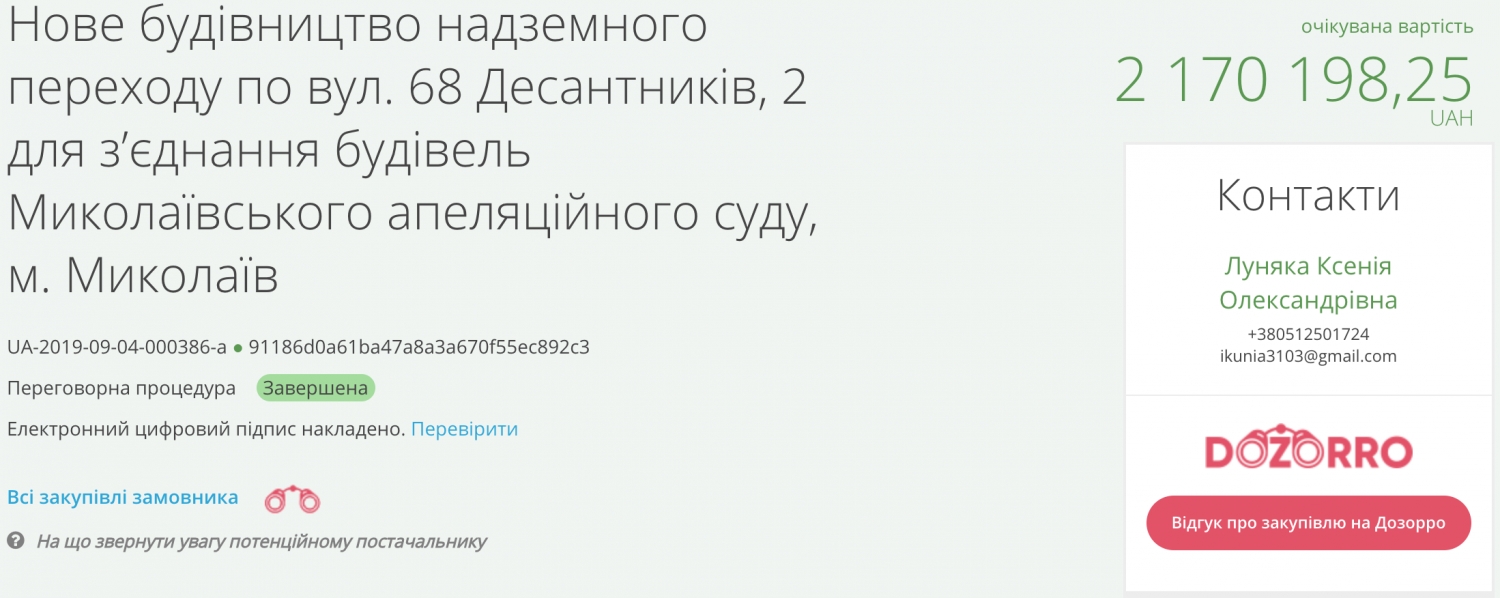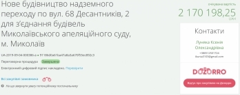Согласно данным ресурса, Апелляционный суд Николаевской области 20 сентября 2019 года заключил договор на 2 миллиона 170 тысяч 198 гривен с ООО «Житлопромбуд-8». В соответствии с договором предприятие должно построить надземный переход, который соединит между собой два здания суда.
