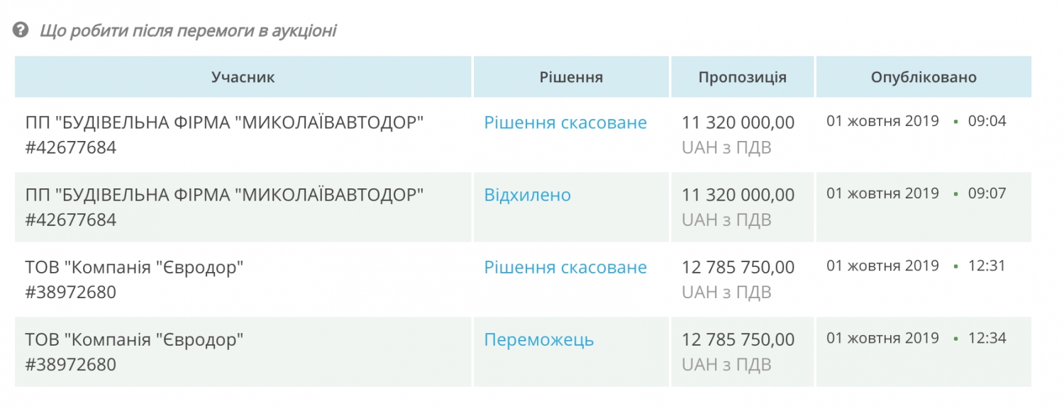 Участие в аукционе приняли всего две компании: «Строительная фирма Николаевавтодор» с предложением в 11 миллионов 320 тысяч гривен и «Компания «Евродор», которая согласилась выполнить работы за 12 миллионов 785 тысяч 750 гривен.