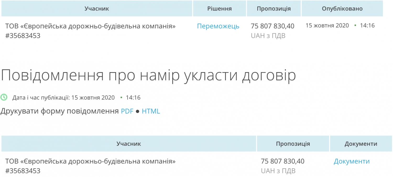Стоит отметить, что в пояснении к объявленной закупке указывается, что в прошлом году компания «Европейская дорожно-строительная компания» уже выполняла работы по капитальному ремонту данного участка трассы Н-14 Николаев — Кропивницкий. Однако, в ходе ремонта были выявлены ранее не учтенные объемы работ, из-за чего в 2020 году по заказу службы автодорог проект ремонта дороги был откорректирован. В итоге чиновники решили, что доверить дальнейшую реализацию данного проекта именно фирме «Европейская дорожно-строительная компания».