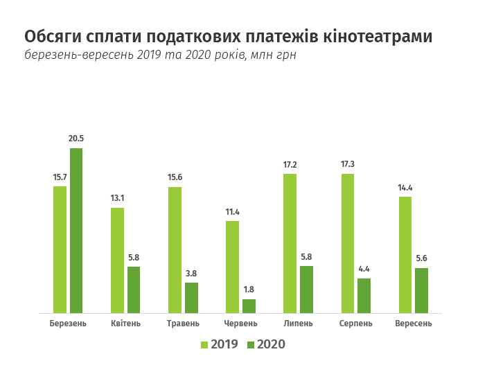 По данным Государственной налоговой службы, в марте-сентябре 2020 года кинотеатры сократили налоговые отчисления более чем в 2 раза по сравнению с аналогичным периодом предыдущего года. Всего за 6 карантинных месяцев они заплатили 47,6 миллиона гривен.