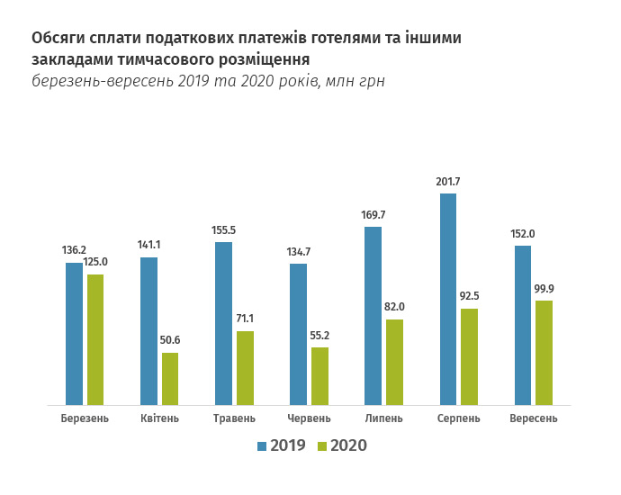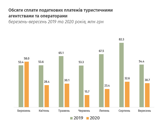 Также существенно снизились налоговые отчисления туристических агентов и операторов. В марте-сентябре 2020 года отчисления от этого бизнеса упали на 49% по сравнению с прошлым годом. В абсолютных числах падение налоговых поступлений составило в общем 210,6 миллионов гривен.
