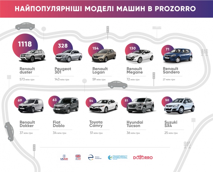 Автомобили Renault Duster для медиков приобрели: 97 в Винницкой области; 47 в Волынской; 32 в Черкасской; 16 в Запорожской. Для медиков Одесской области местные власти приобрели 42 Suzuki SX4. Нацполиция приобрела автомобили спецназначения на базе Renault Duster. 200 из них в мае, еще 65 — в ноябре.