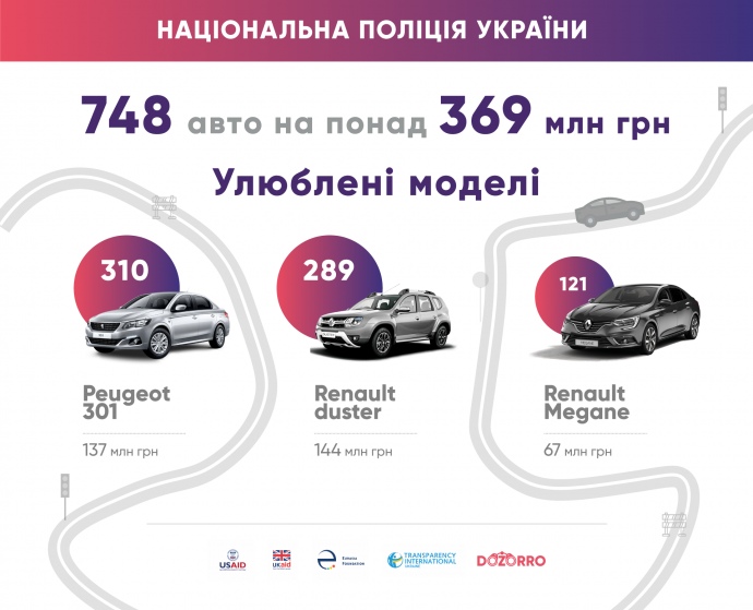 Больше всего авто в этом году приобрело Министрество внутренних дел. Так, 748 машин на 369 млн грн приобрела Нацполиция. Их купили у одного поставщика — Спец-Ком-Сервис.