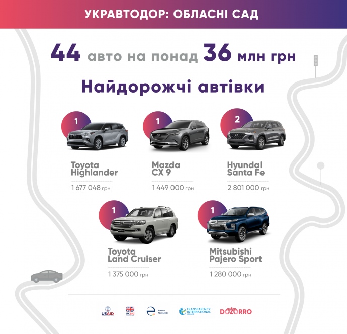 Областные службы автомобильных дорог Укравтодора в 2020 году приобрели 44 авто на 36,3 миллионов гривен. Среди них были и премиальные Toyota Land Cruiser, Toyota Highlander, Mazda CX 9 и Mitsubishi Pajero Sport.