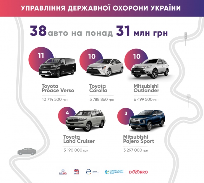 Управление госохраны приобрело 38 авто за 31,5 миллионов гривен. В июле купили 11 Toyota Proace Verso на 10,7 миллионов гривен, в октябре — 4 Toyota Land Cruiser Prado за 5,2 миллиона гривен, а в ноябре — 3 Mitsubishi Pajero Sport.
