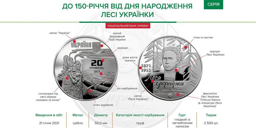 Национальный банк Украины с 21 января 2021 года вводит в обращение памятную монету, посвященную 150-летию с дня рождения украинской поэтессы и драматурга Леси Украинки. Об этом сообщается на сайте банка.