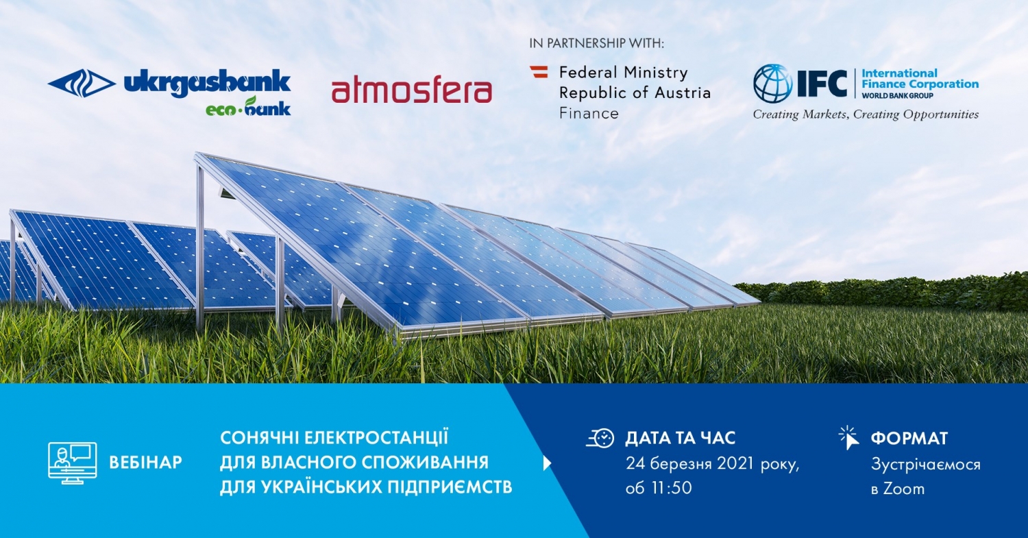 Укргазбанк вместе с Международной финансовой корпорация (IFC) 24 марта проведут вебинар «Солнечные электростанции для собственного потребления для украинских предприятийє».