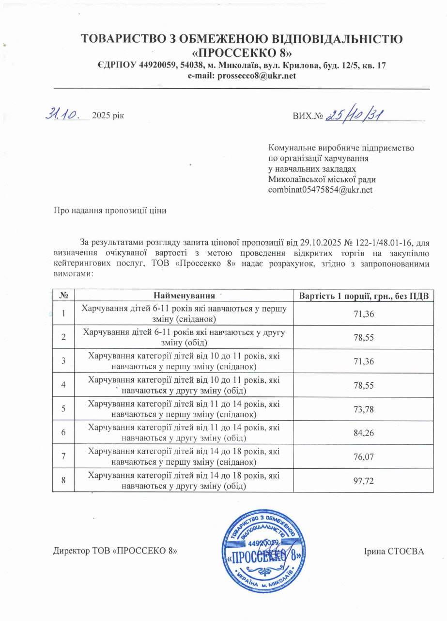 В ответе предприятие отметило, что ориентировалось на открытые рыночные цены и коммерческие предложения трех потенциальных поставщиков: ООО «Проссекко 8», ФЛП Татьяны Камашевой и ООО «Насолода РК». Договор в конце концов подписали именно с «Проссекко 8».