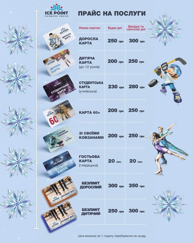 Самая большая ледовая арена города — «ICE PARK» — предлагает безлимитное катание всего за 400 гривен. То есть посетитель может кататься сколько угодно времени, пока находится на арене. В стоимость также входит аренда коньков. «Помощник» обойдется в 200 гривен в час, а услуги инструктора по катанию стоят 300 гривен за 45 минут.