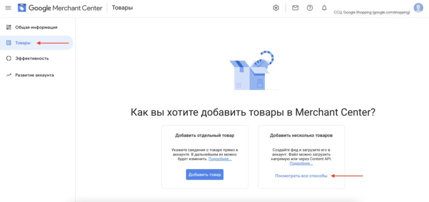 Важно! Google регулярно обновляет требования к рекламодателям. Чтобы не потерять время на ошибках при настройке Merchant Center, используйте данную инструкцию — там разобрана актуальная процедура настройки шаг за шагом.