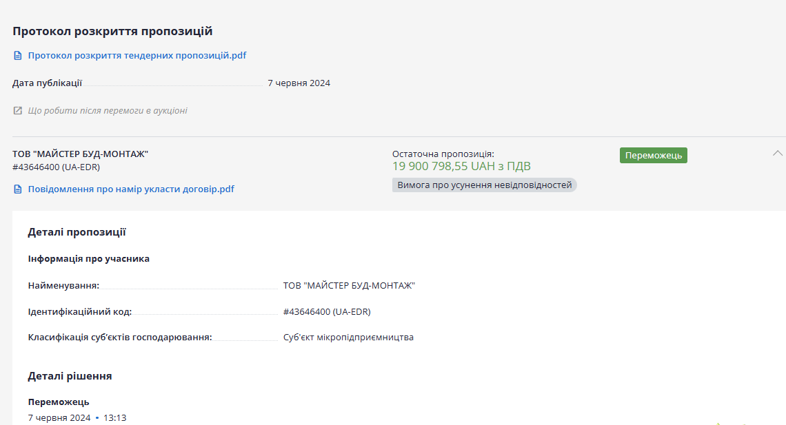 Именно это предприятие выиграло тендер на реконструкцию укрытия в лицее — оно было единственным участником торгов и предложило выполнить работы за 19,9 миллиона гривен при ожидаемой стоимости 20,9 миллиона гривен. Договор подписали в июне 2024 года, и подрядчик получил 11,5 миллиона гривен.