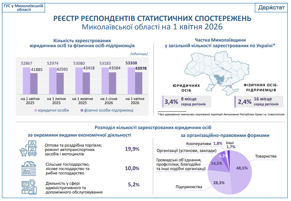 В общеукраинском рейтинге Николаевская область занимает восьмое место по количеству юридических лиц с долей 3,4% и 16-е место по количеству ФЛП (2,4% от общего количества в стране).