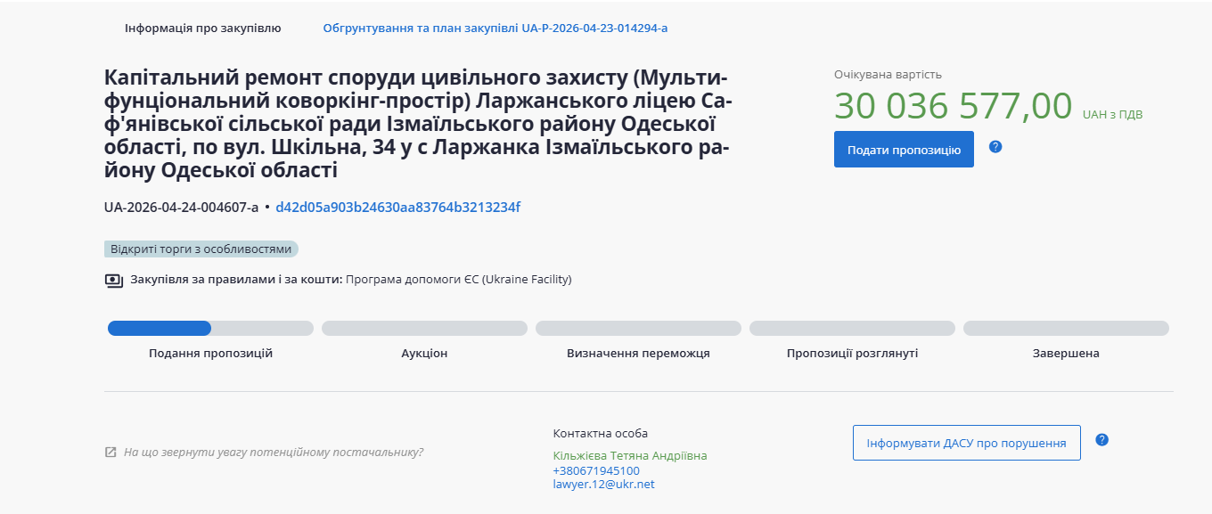 Стоимость проекта составляет более 30 миллионов гривен. Заказчиком работ выступает управление образования Сафьяновского сельского совета. Подать тендерные предложения можно до 10 мая.