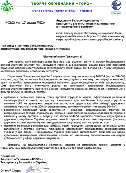 Руководитель представительства в Украине Transparency International Алексей Хмара направил в адрес Президента Украины Виктора Януковича письмо о своем выходе из состава Национального антикоррупционного комитета при Президенте Украины, пишут «Комментарии».