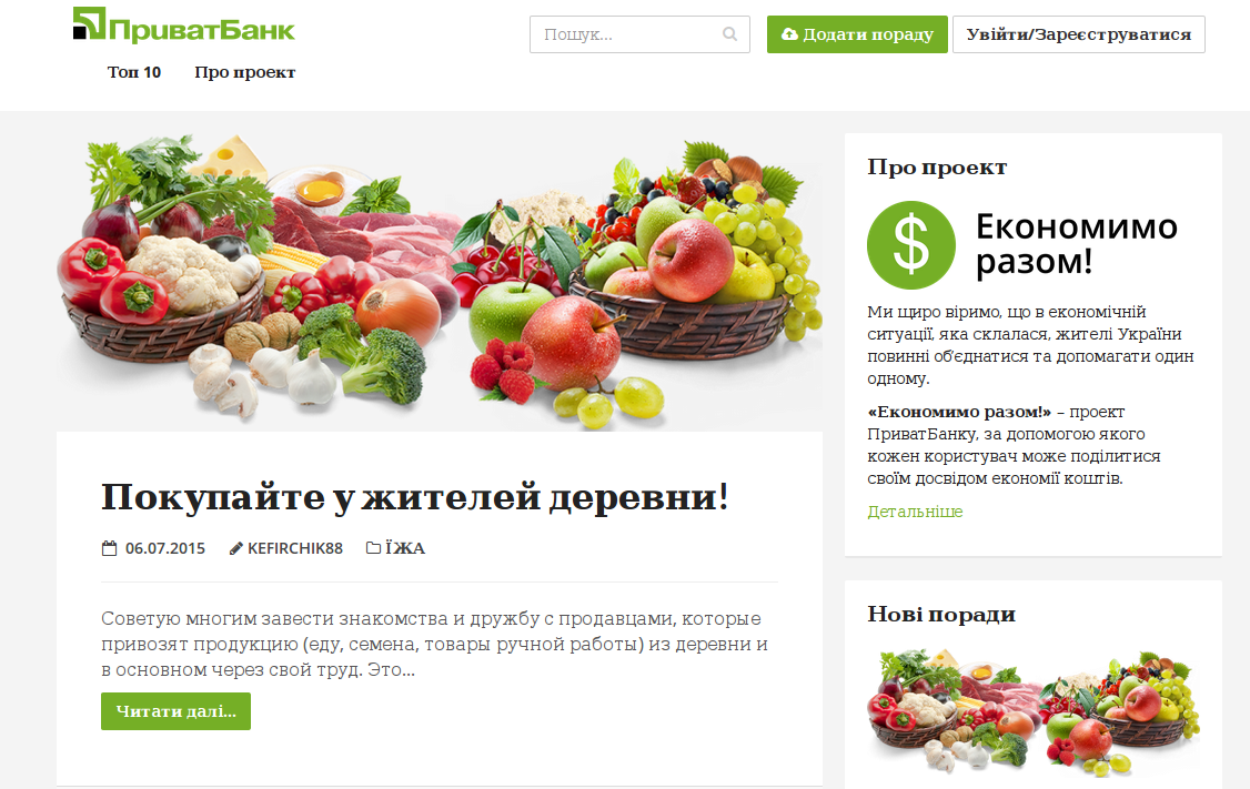 На специальном сайте проекта https://econom.pb.ua/ любой желающий может рассказать о том, как сэкономить на еде, одежде, развлечениях или бытовых мелочах. Чтобы добавить новый совет в народную энциклопедию, нужно просто кликнуть на кнопку «Добавить совет» и заполнить все необходимые поля.